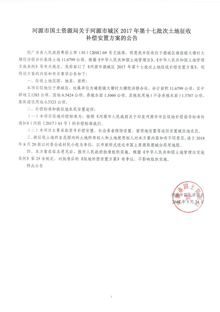關于河源市城區2017年度第十七批城鎮建設用地土地征收補償安置公告