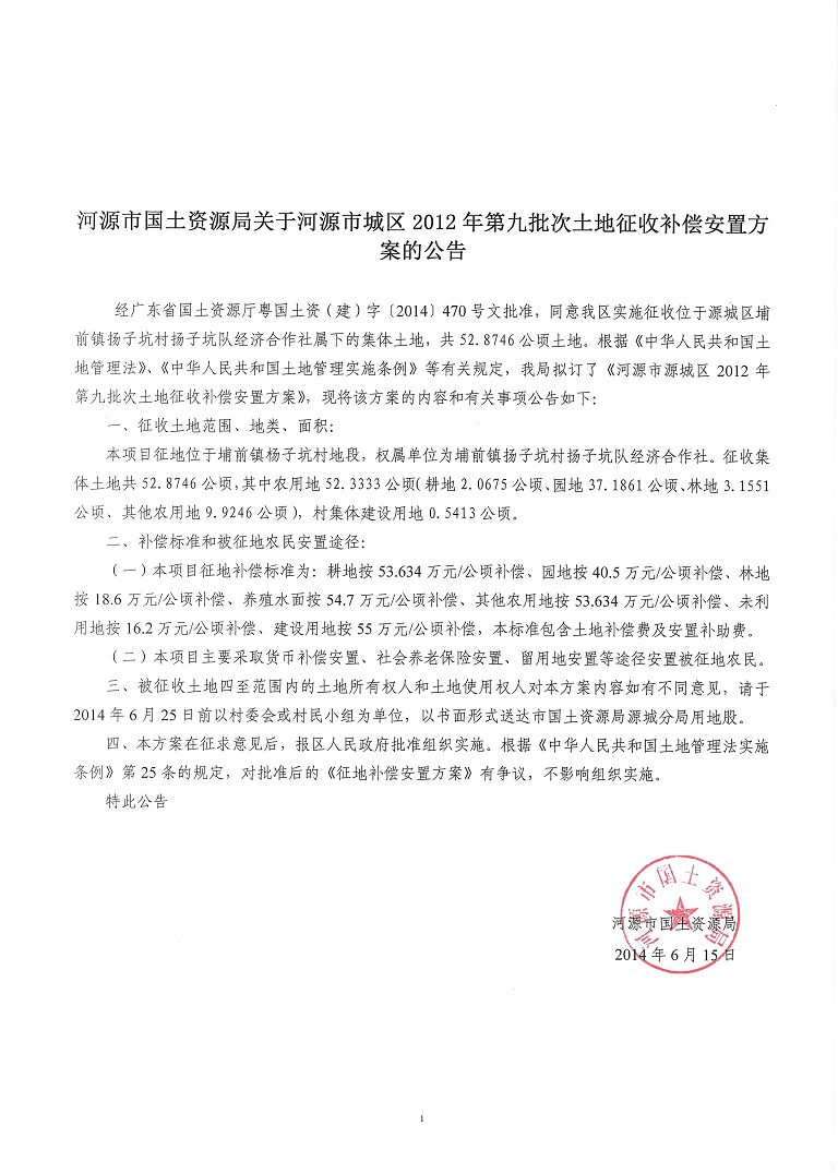 河源市國土資源局關(guān)于河源市城區(qū)2012年第九批次土地征收補償安置方案的公告