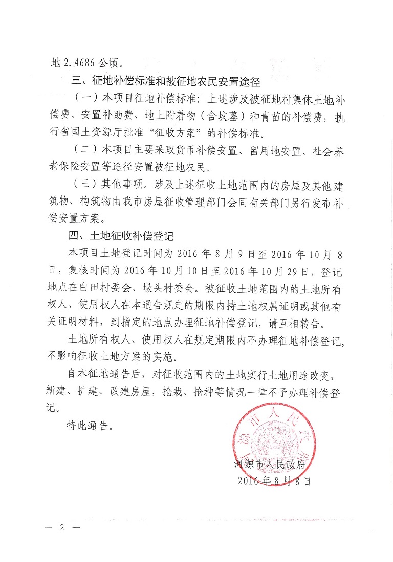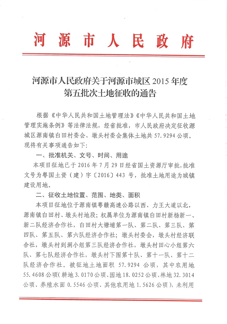 河源市人民政府關于河源市城區2015年第五批次土地征收公告