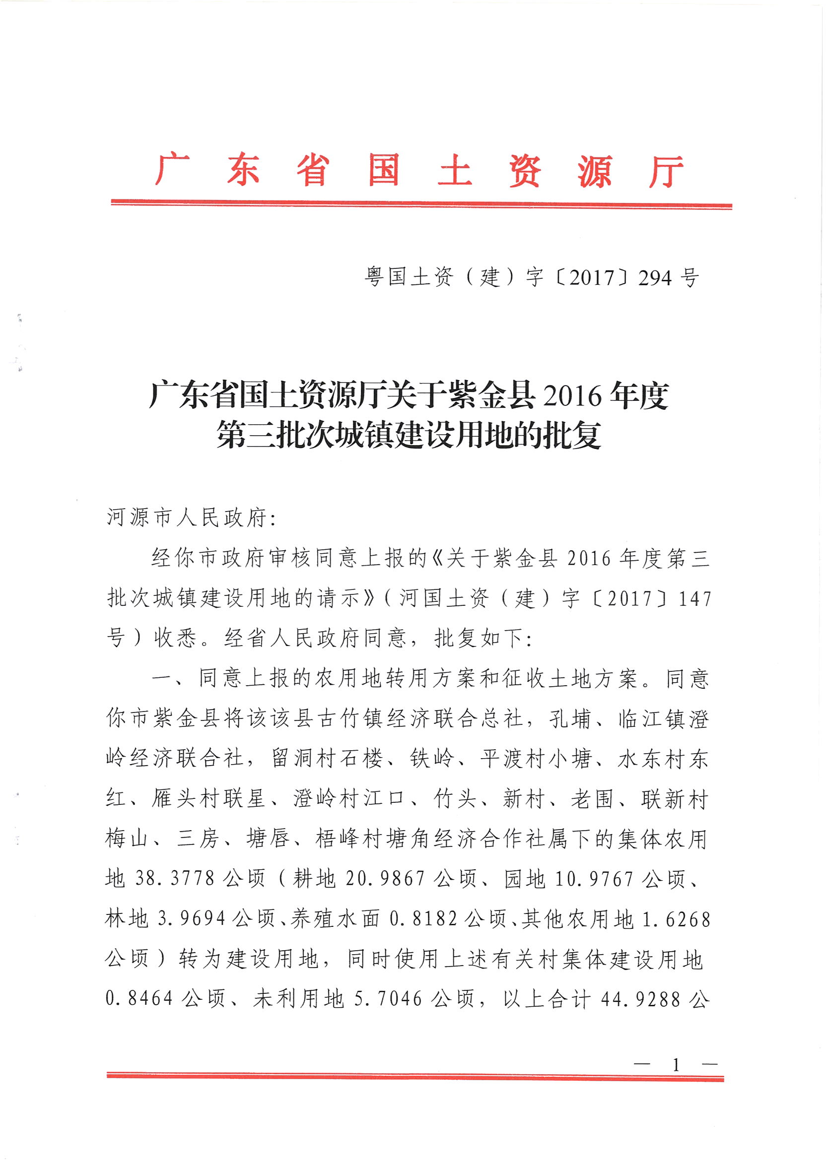 廣東省國土資源廳關于紫金縣2016年度第三批次城鎮建設用地的批復