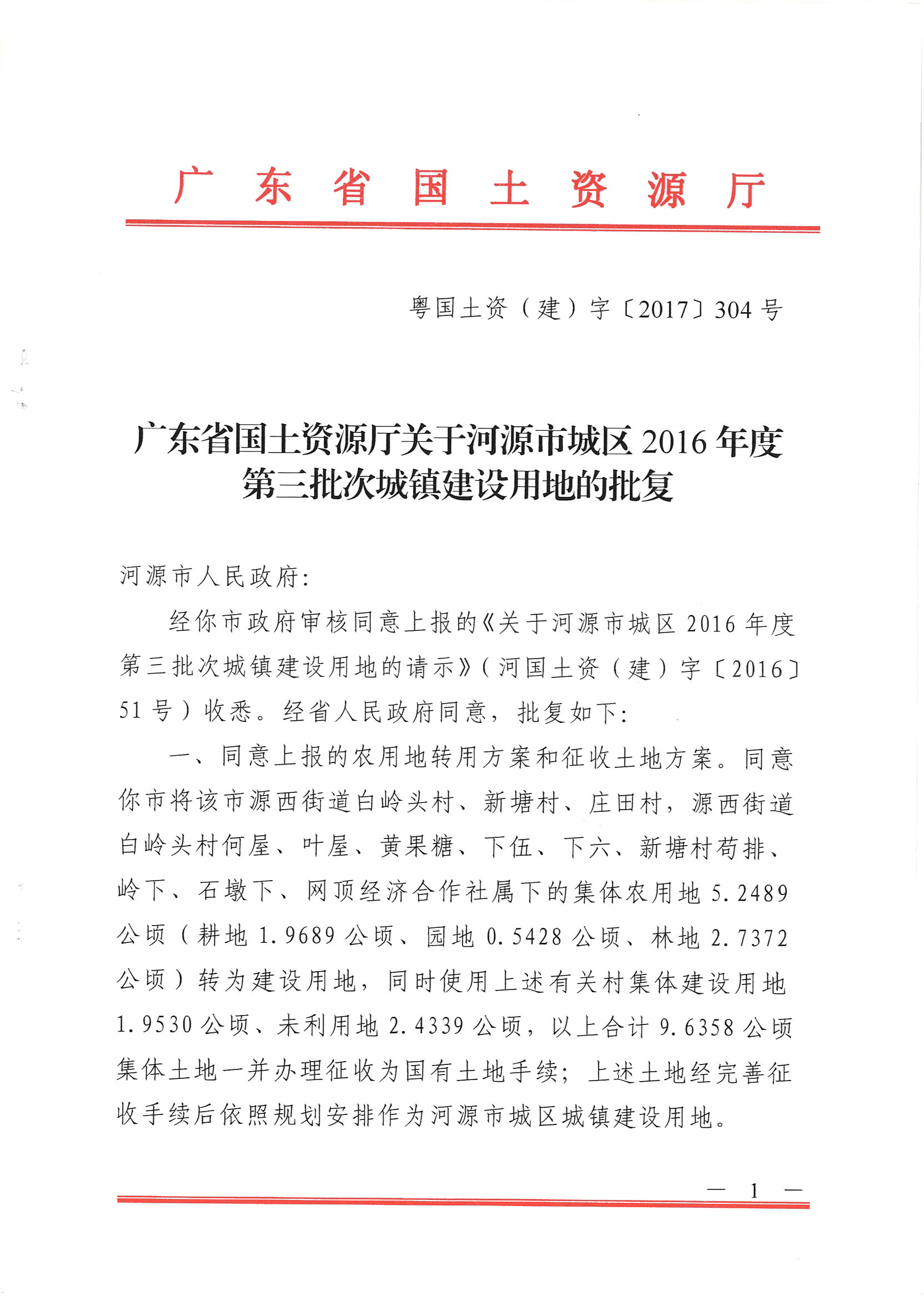 廣東省國(guó)土資源廳關(guān)于河源市城區(qū)2016年度第三批次城鎮(zhèn)建設(shè)用地的批復(fù)