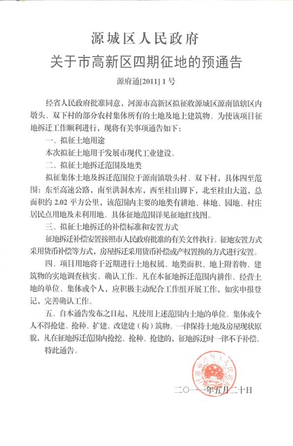 源城區(qū)人民政府關(guān)于市高新區(qū)四期征地的預(yù)通告