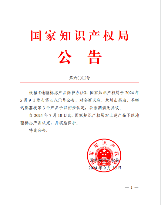 日前,國家知識產(chǎn)權(quán)局發(fā)布第六〇〇號公告,自2024年7月10日起對“龍川山茶油”實施地理標志產(chǎn)品保護。這是龍川縣首個國家地理標志保護產(chǎn)品,也是河源繼“河源米粉”“連平鷹嘴蜜桃”“紫金春甜桔”之后的第4個國家地理標志保護產(chǎn)品。